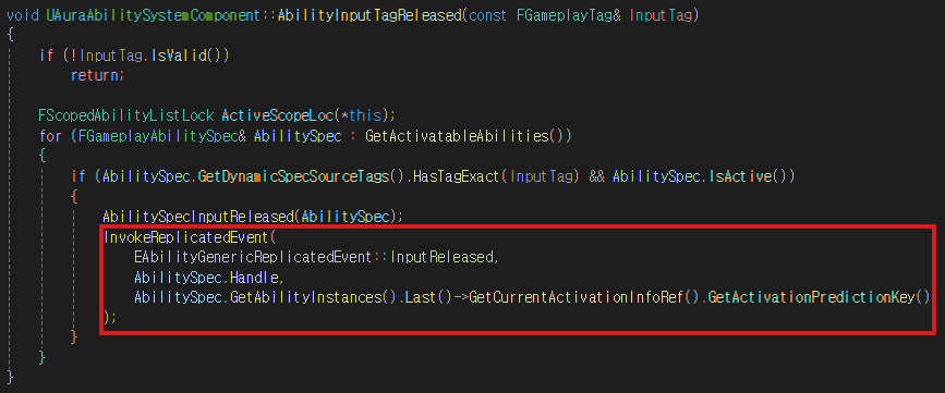 어빌리티와 연결된 Tag를 갖고 있는 키의 입력을 뗀 경우 실행하는 AbilityInputTagPressed 함수에서도