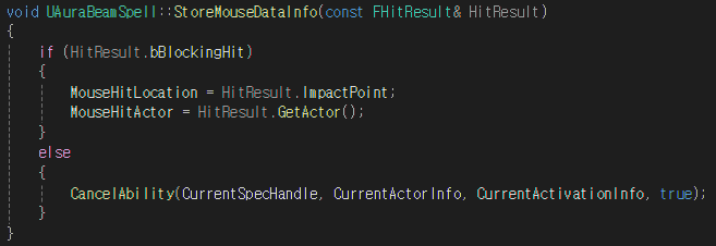 매개변수로 받은 HitResult가 유효하다면, 클릭한 위치와 클릭한 Actor를 캐싱한다