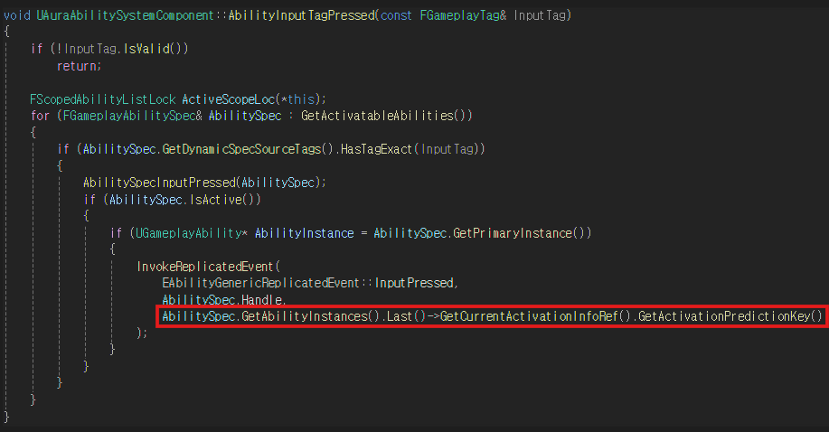 위와 같이 수정하여 AbilityInputTagPressed 함수에서 엔진의 버전에 맞게 예측키를 사용한다