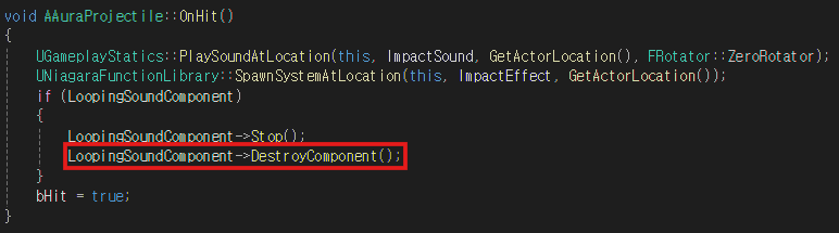 OnHit 함수에도 동일한 로직을 추가하여 클라이언트에서도 AudioComponent를 제거한다