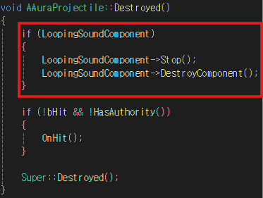 Destroyed 함수에 위와 같이 로직을 추가하여 투사체가 파괴되면