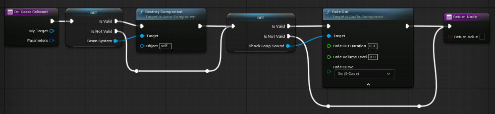로직은 위와 같이 구성하여 생성된 NiagaraComponent를 제거하고, SFX를 서서히 중단한다