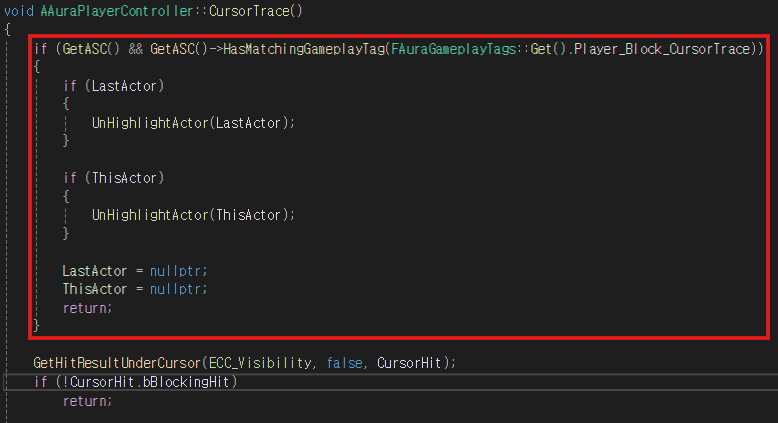 이동 함수와 입력을 통해 어빌리티를 발동시키는 함수 그리고 커서 트레이스 함수에 위와 같이 로직을 추가하여