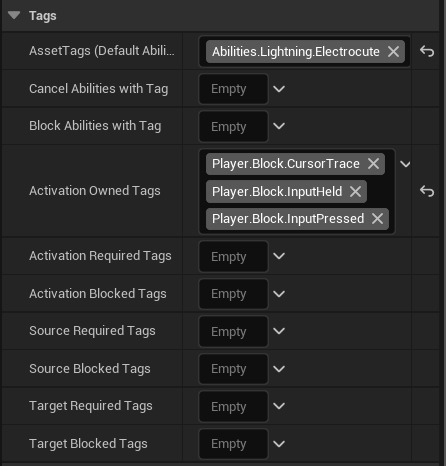전기광선이 발사될 때 + 전기광선이 발사중일 때 재생할 GameplayCue와 관련된 Tag를 위와 같이 추가한다
