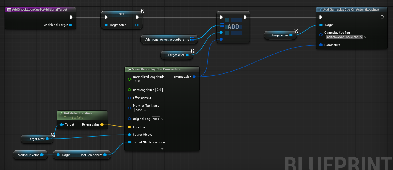 저장된 인접한 다른 Actor들을 대상으로 AddShockLoopCueToAdditionalTarget 함수를 호출한다