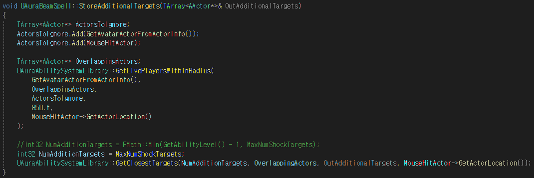 - StoreAdditionalTargets 함수 : 타격한 전기광선이 연쇄적으로 타격할 타겟들을 저장하는 함수