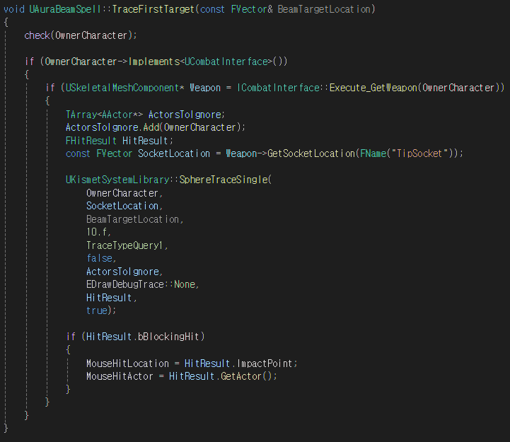 - TraceFirstTarget 함수 : 전기광선이 첫번째로 타격한 타겟을 저장하는 함수