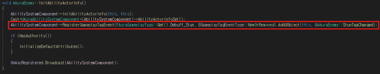 InitAbilityActorInfo 함수에 로직을 추가하여 기절 상태의 Tag가 추가되거나 제거되면 호출할 함수를 바인드한다