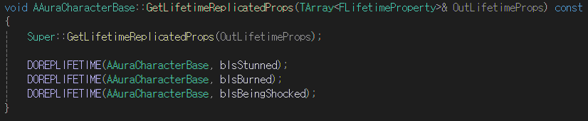 - GetLifetimeReplicatedProps 함수 : 추가한 불리언 변수들을 Replicate하는 함수