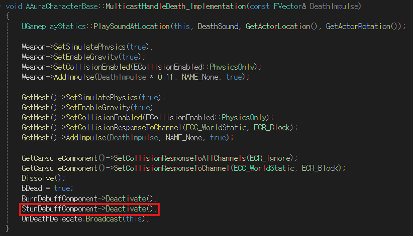 MulticastHandleDeath 함수에 로직을 추가하여 캐릭터가 쓰러지면 기절 상태의 FX 효과를 비활성화한다