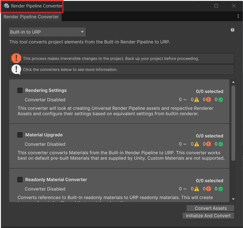 Window - Rendering - Render Pipeline Converter를 통해 프로젝트의 기본 Render Pipeline 설정을 변경가능하다
