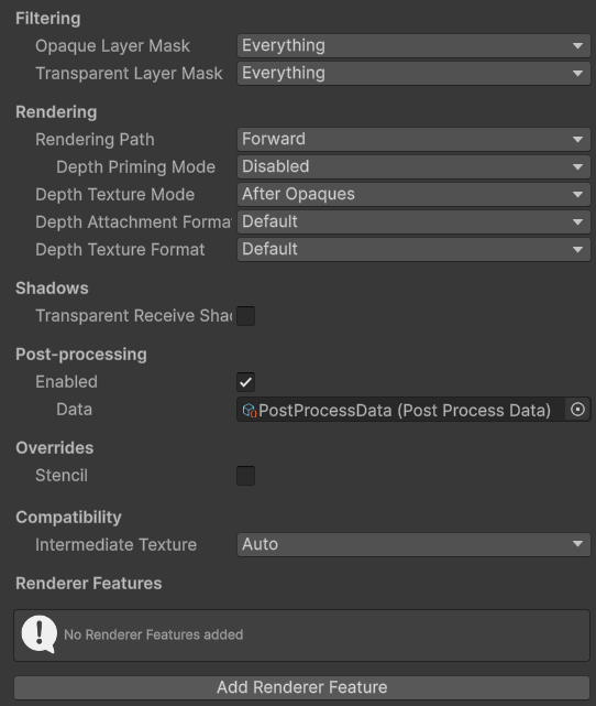 Renderer Pipeline에 대한 옵션은 위와 같이 설정할 수 있다