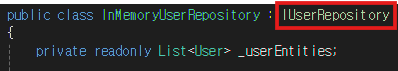 IUserRepository 인터페이스를 상속받아 구현하며 멤버변수로 User를 저장하는 List를 사용한다
