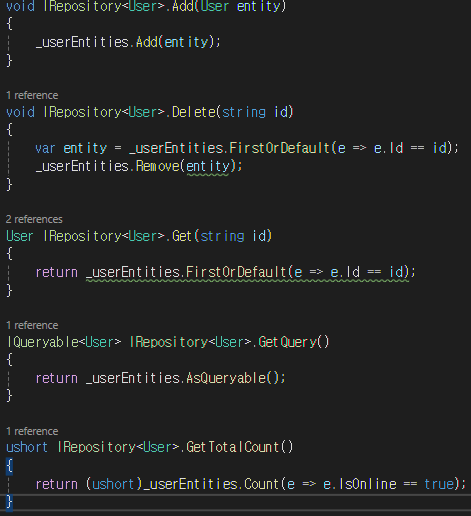 따라서 IRepository 인터페이스를 상속받아 구현하며 오버라이드해야 하는 함수들은 위와 같다