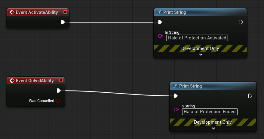 위와 같이 로그를 찍도록 ActivateAbility 이벤트와 OnEndAbility 이벤트를 구현한다