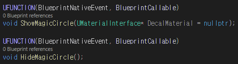 2개의 함수를 추가하여 캐릭터에서 소환진을 보여주고, 숨길 수 있도록 설정한다
