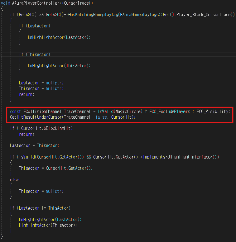 CursorTrace 함수를 위와 같이 수정하여 플레이어 전용 CollisionChannel을 사용하여 마우스 커서를 처리한다