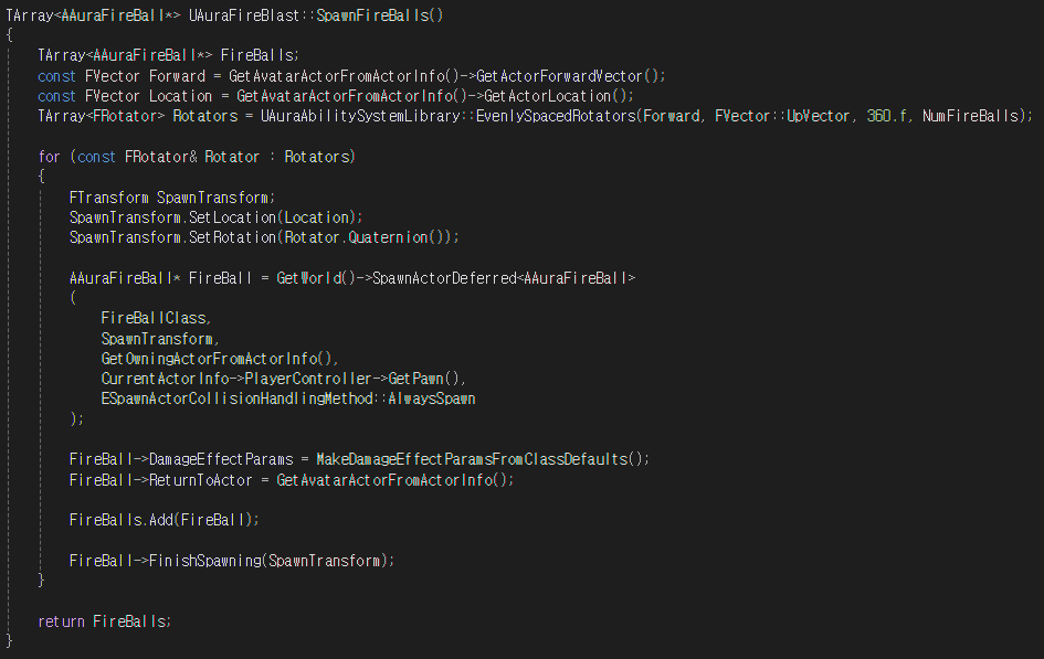 - 설정이 끝난 화염구를 지역 컨테이너에 저장하고 FinishSpawning 함수를 호출하여 스폰 종료