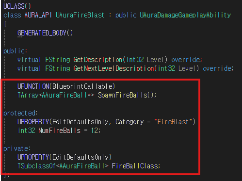 화염폭풍 스킬의 GA 클래스인 AuraFireBlast 클래스를 위와 같이 수정한다