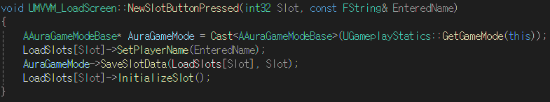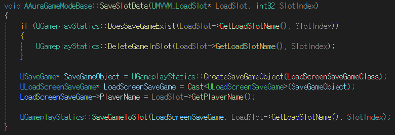 - 캐스팅한 GameMode로부터 SaveSlotData 함수를 호출하여 해당하는 슬롯의 이름으로 데이터 파일 저장