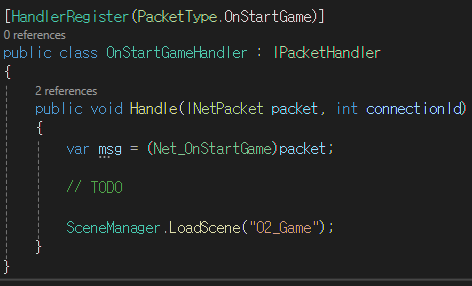 서버로부터 받은 Net_OnStartGame 패킷을 핸들링하는 OnStartGameHandler 클래스를 생성한다