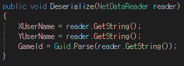 Deserialize 함수는 위와 같이 정의하여 패킷을 역직렬화하여 가져온 값으로 프로퍼티를 설정한다