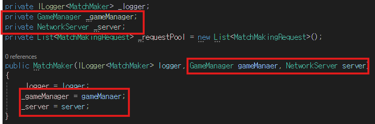 멤버변수에 GameManager와 NetworkServer를 추가하고 생성자에서 설정한다