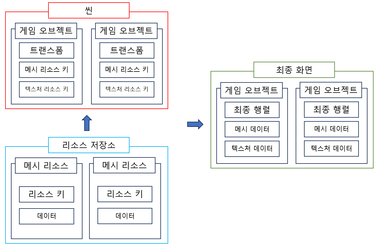 Scene 데이터와 Resource 데이터를 결합하여 최종 게임 화면이 렌더링되도록 설계되었다