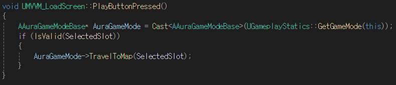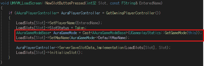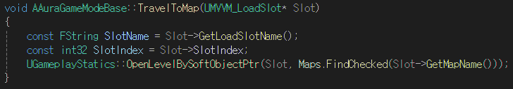 GameMode를 가져오고 선택한 슬롯이 유효하다면 GameMode의 TravelToMap 함수를 호출한다