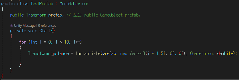 프리팹 애셋의 인스턴스는 Instantiate 함수에 의해 생성할 수 있다