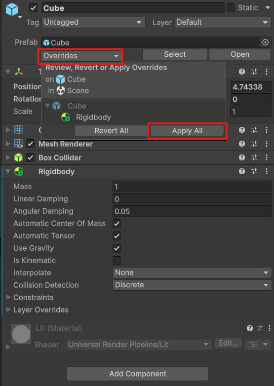 - Scene의 프리팹의 인스턴스를 수정한 후에 Apply All로 프리팹 Asset을 수정