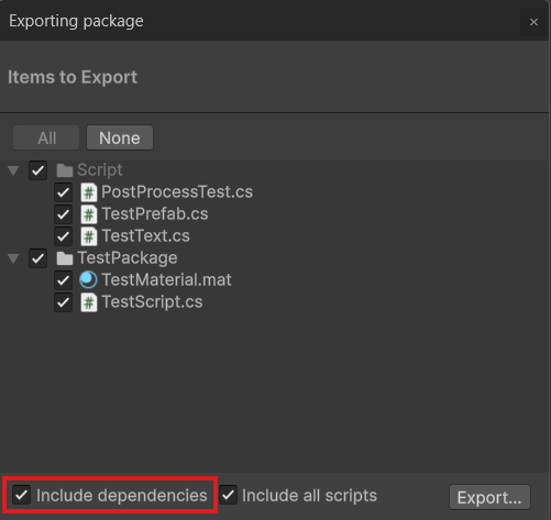 이때 Include dependencies 옵션을 체크하면 선택한 에셋이 사용하는 참조 파일을 자동으로 포함하여 내보낸다