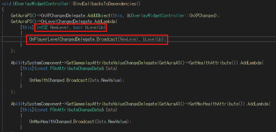 BindCallbacksToDependencies 함수를 위와 같이 수정하여 교체한 델리게이트에 맞춰서 브로드캐스트한다