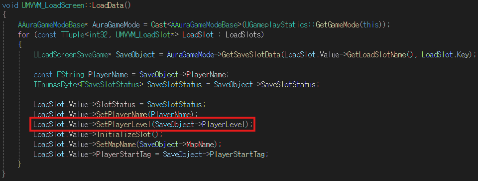 LoadData 함수에 위와 같이 로직을 추가하여 저장된 데이터를 로드한 데이터 슬롯의 플레이어 레벨을 설정한다
