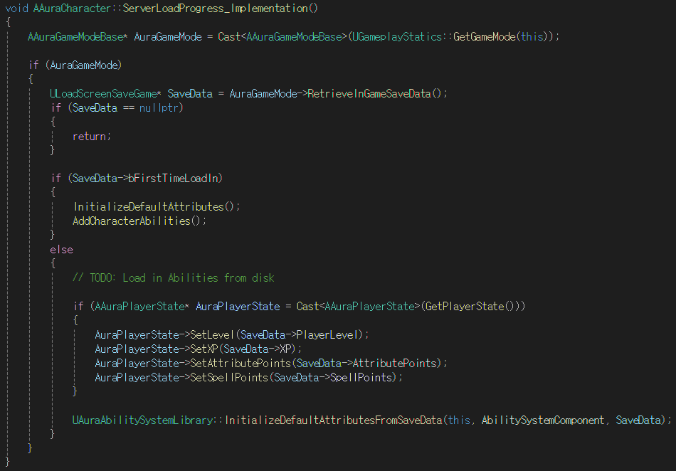 - 그렇지 않은 경우 : 가져온 SaveGame의 데이터를 사용하여 플레이어의 상태를 설정