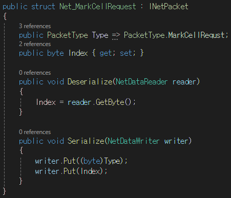 - 클라이언트에서 서버로 전송하는 패킷 : 보드판에 마커를 놓은 후에 전송하는 MarkCellRequest 패킷
