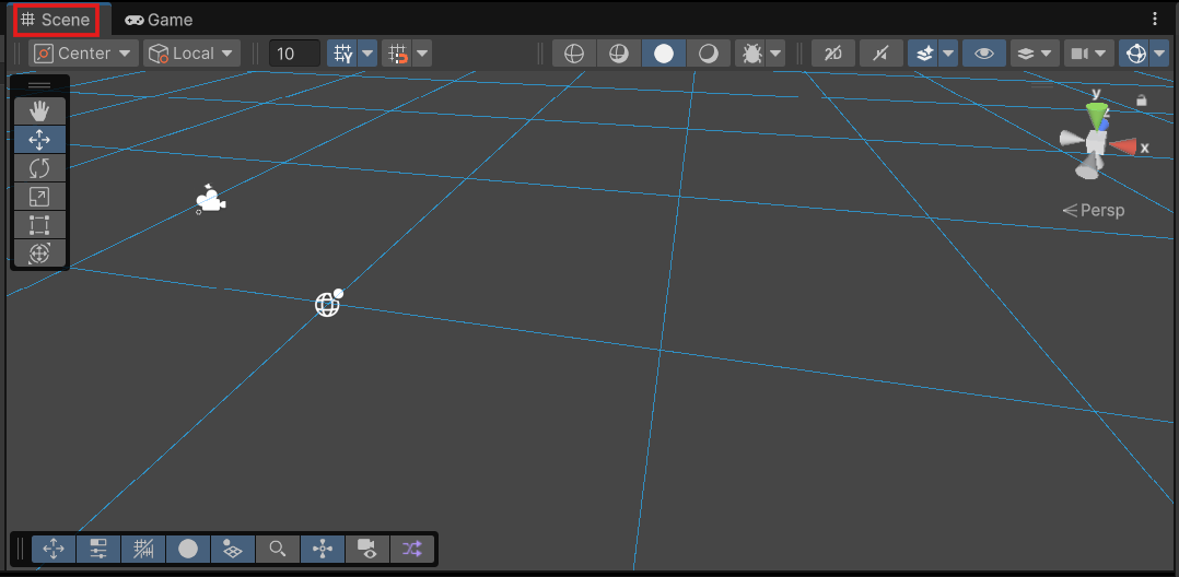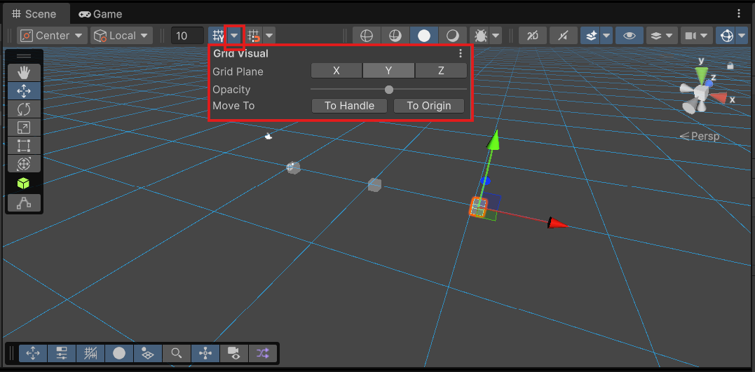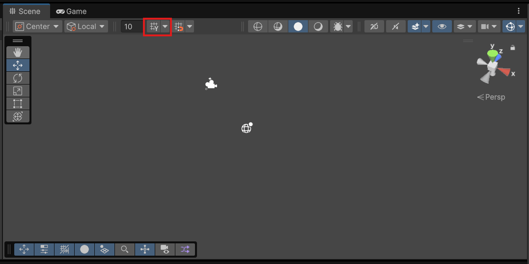 Scene 뷰의 좌측 상단의 그리드 아이콘으로 Grid Visibility를 활성화 / 비활성화할 수 있다