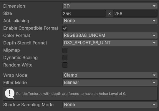 - Size 설정 : 텍스처의 해상도를 의미, 높을수록 품질이 좋으나 성능 비용 발생함, 렌더링 성능에 직접적인 영향을 줌
