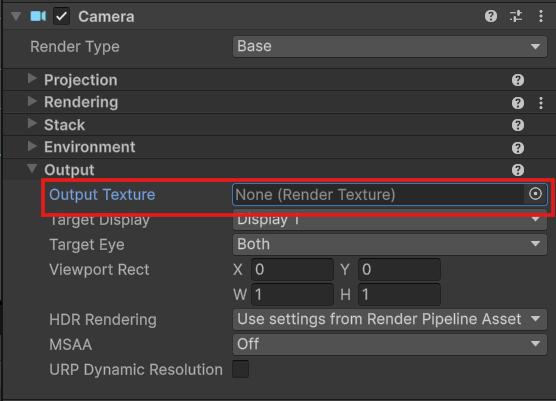 카메라 컴포넌트의 Output -> Ouptut Texture 슬롯에 생성한 Render Texture 애셋을 할당하여 적용한다