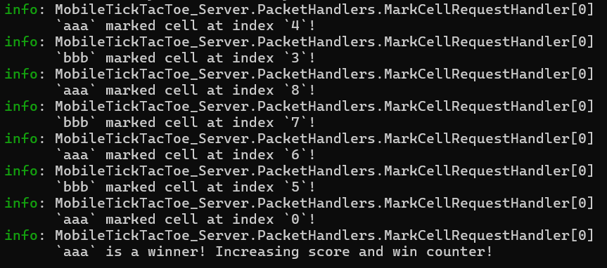 - 놓여진 마커의 결과가 승리인 경우 : 마커를 놓은 플레이어의 승수와 점수 증가 + 로그를 찍음