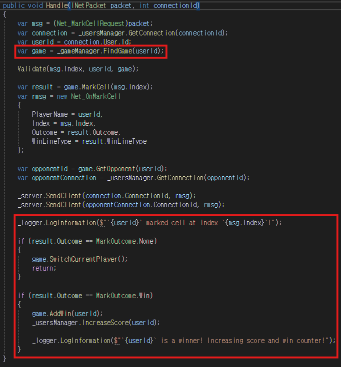 서버로부터 Net_OnMarkCell 패킷을 전달받은 후에 현재 플레이어를 전환하고 로직을 진행한다