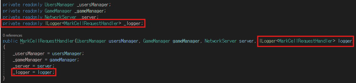 클라이언트로부터 전달받은 MarkCellRequest 패킷을 핸들링하는 핸들러 클래스에 대한 Logger를 추가하고