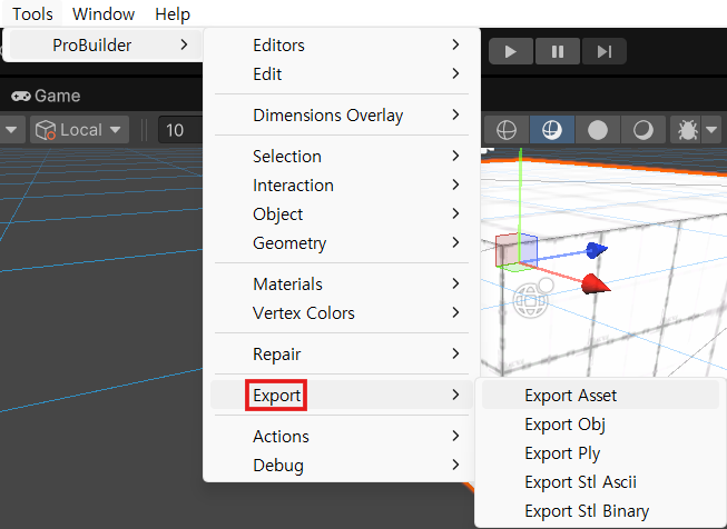 작업이 끝난 모델을 대상으로 상단 Window - ProBuilder - Export 옵션을 선택하여 외부로 내보낼 수 있다