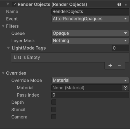 - Render Object의 Overrides - Depth Test를 Greater로 설정한 Render Object 추가