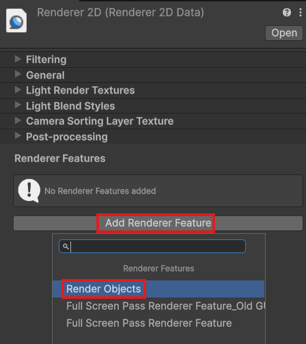 사용중인 Renderer 애셋의 Add Renderer Feature - Render Objects 옵션을 선택하여 설정할 수 있다