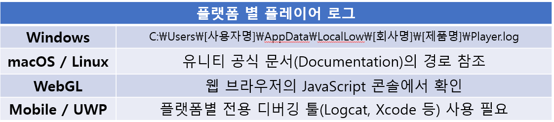 플레이어 로그의 경우 실행중인 플랫폼마다 저장하는 위치와 방법이 다르므로 이에 유의하여 작업해야 한다