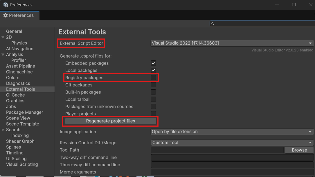 - External Script Editor 옵션 : 설치한 패키지와 호환되는 에디터를 설정