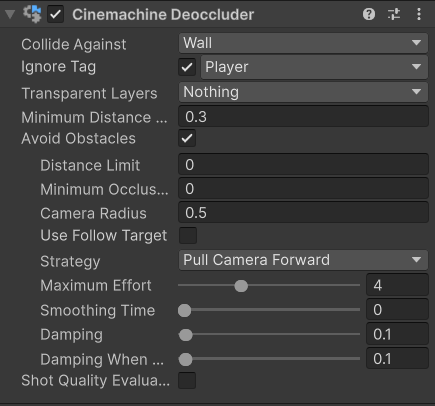 Cinemachine Deoccluder 컴포넌트를 위와 같이 추가하여 카메라의 충돌 처리를 진행한다