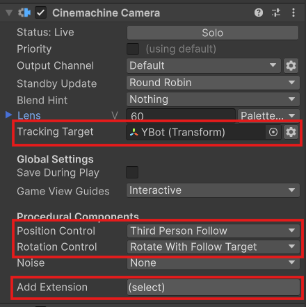 Cinemachine Camera 컴포넌트를 위와 같이 설정한다