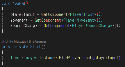 - Start 함수 : InputManager 객체의 BindPlayerInput 함수를 호출하여 Action 연결